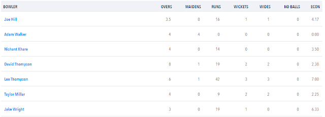 Check out Adam Walker 4 overs for 0. I think Taylor Millar with 2 has been credited with one of Jakes wickets? I'm not sure though.